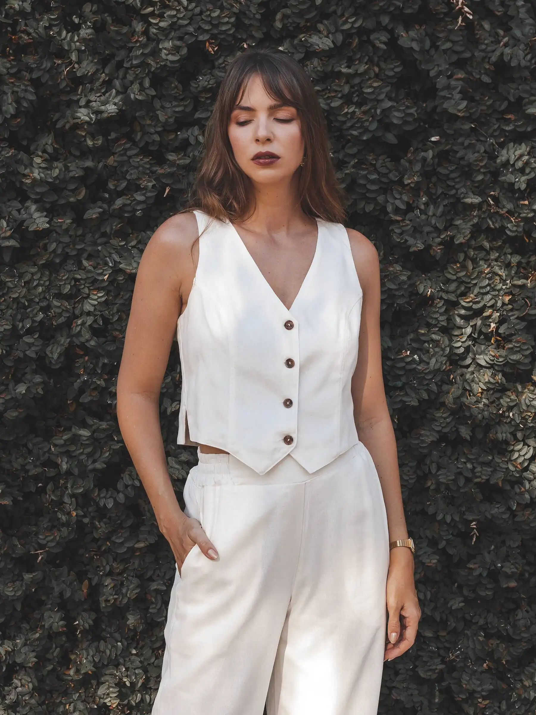 A sua cor branca transmite leveza e elegância, sendo fácil de combinar com camisas, blusas ou tops, criando looks versáteis para diferentes ocasiões. Pode ser usado tanto em ambientes profissionais como em produções casuais mais elegantes.